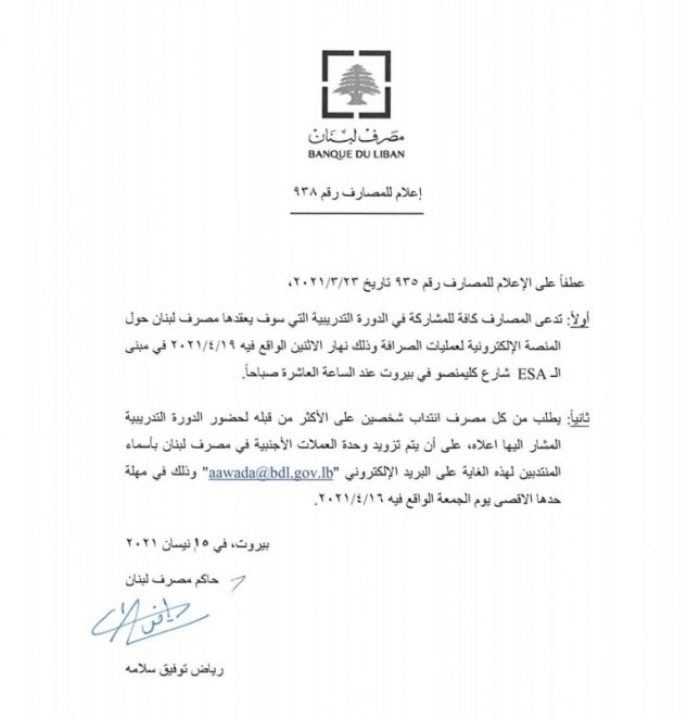 إعلام رقم 938 من مصرف لبنان إلى المصارف كافة