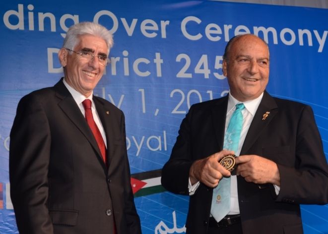أقامت أندية الروتاري في لبنان حفل تسلّم وتسليم بين المحافظ الحالي للمنطقة الروتارية 2450 "كيفورك مهدسيان" من قبرص والمحافظ القادم للمنطقة الروتارية الجديدة 2452 الشيخ جميل معوض من لبنانفيقاعة "بافيون رويال" - البيال، بحضور ممثل رئيس الجمهورية ورئيس مجلس الوزراء معالي الوزير نقولا نحاس، ممثل الرئيس المكلف تمام سلام محمد المشنوق وعدد من الوزراء والنواب ورؤساء بلديات ووجوه إعلامية و سياسية وحشد من الروتاريين من لبنان.ألقى المحافظ الحالي "كيفورك مهدسيان" كلمة معلناً فيها أنه تمّ العمل على عدة مشاريع مختلفة ضمن الدول التسع في المنطقة، ولهذا السبب ندعى بإسم "بناة السلام"، وهذه هي واحدة من أسس منظمة الروتاري الدولية. أما المحافظ القادم للسنة الروتارية 2013- 2014 جميل معوض فقد عرض المشاريع التي يتم التخطيط لها للعمل بها خلال السنة القادمة، وذلك حسب دراسات أجريت على حاجات المجتمع اللبناني، فأعلن حالة الطوارىء بعد إكتشاف نسبة تلوث المياه التي تصل الى المدارس الرسمية.