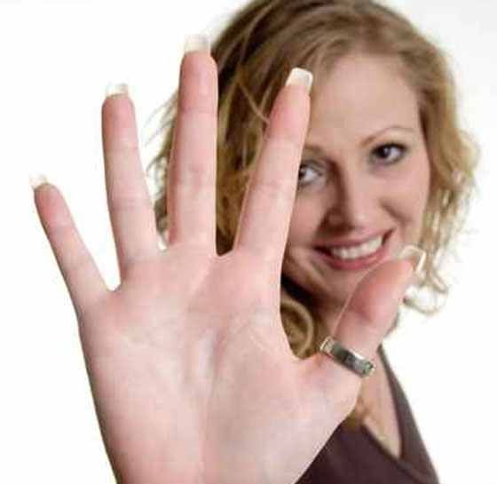 عدم وضع الخواتم: إذا كنت تكتفين بوضع خاتم الخطوبة أو الزواج أو ترفضين وضع الخواتم، فهذا دليل على شخصية متواضعة تكره المظاهر وتحب التّجديد.(صورة رقم 7)